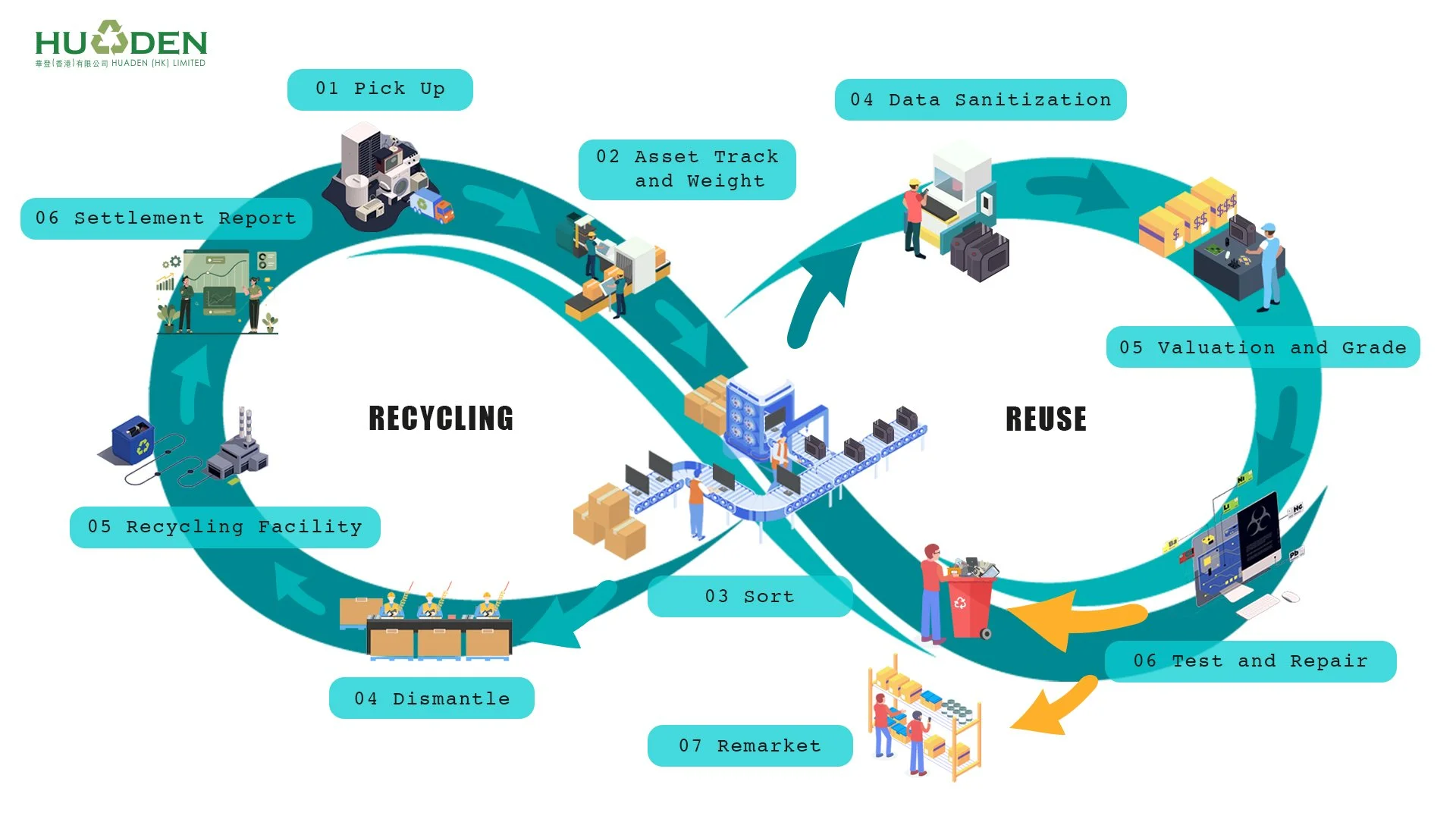 Huaden Recycling guarantees the clean and secure removal of IT assets. We help you safely dispose of any equipment that cannot be resold, protects privacy, ensures compliance, and safeguards the environment with a high waste diversion from landfill for all electronics waste.